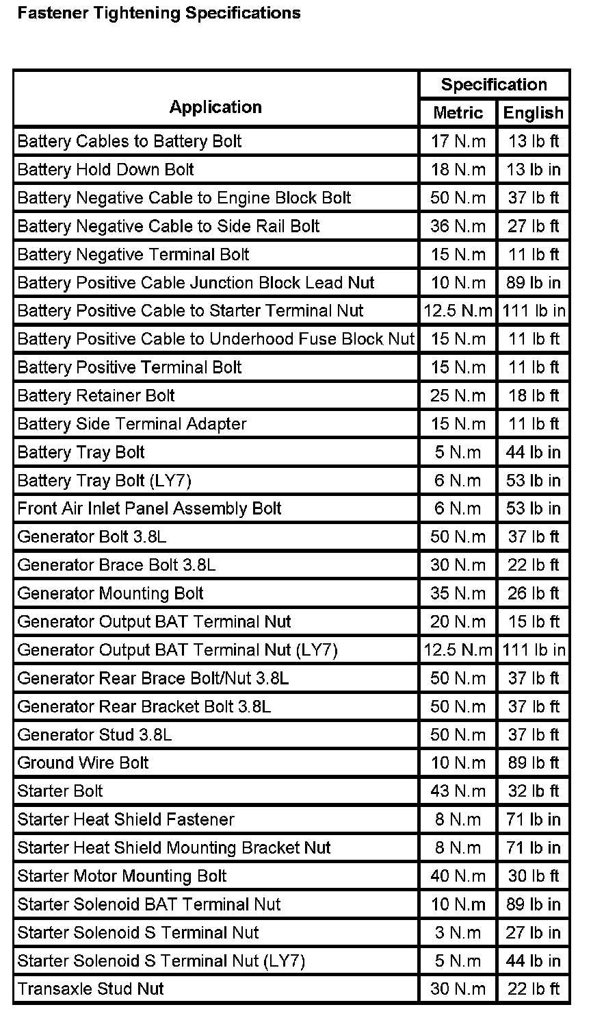 Starting and Charging: Specifications