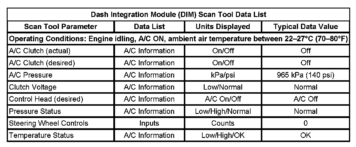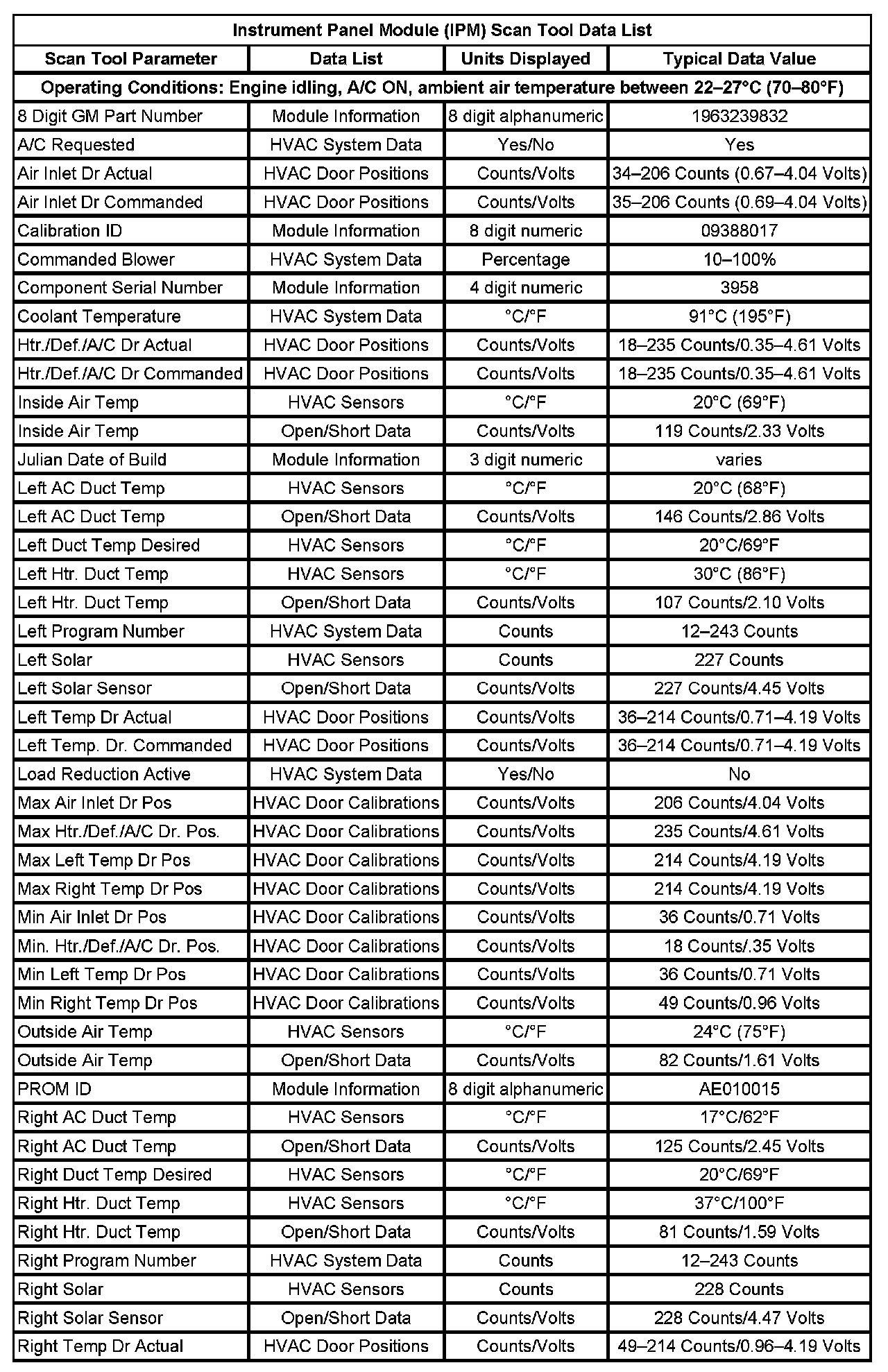 Use the Scan Tool Data Display Values and Definitions Information in order to assist in diagnosing the Instrument Panel Integration Module (IPM) problems. Compare the vehicles actual scan tool data with the typical data display value table information. Use the data information in order to aid in understanding the nature of the problem when the vehicle does not match with the typical data display values.