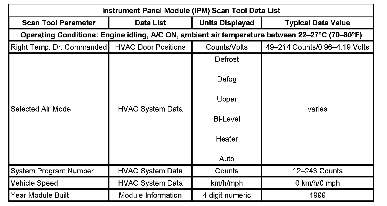 Instrument Panel Module (IPM) Scan Tool Data List Part 2: