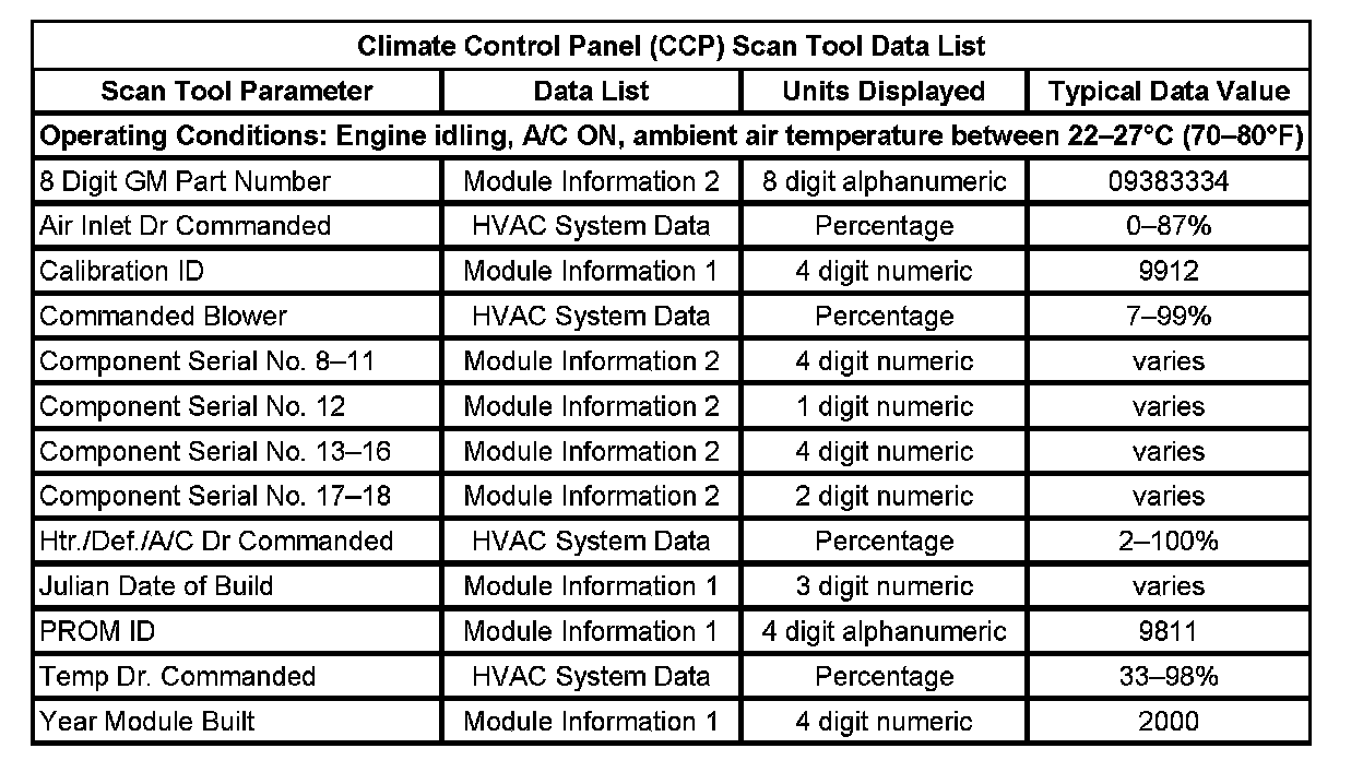 Climate Control Panel (CCP) Scan Tool Data List: