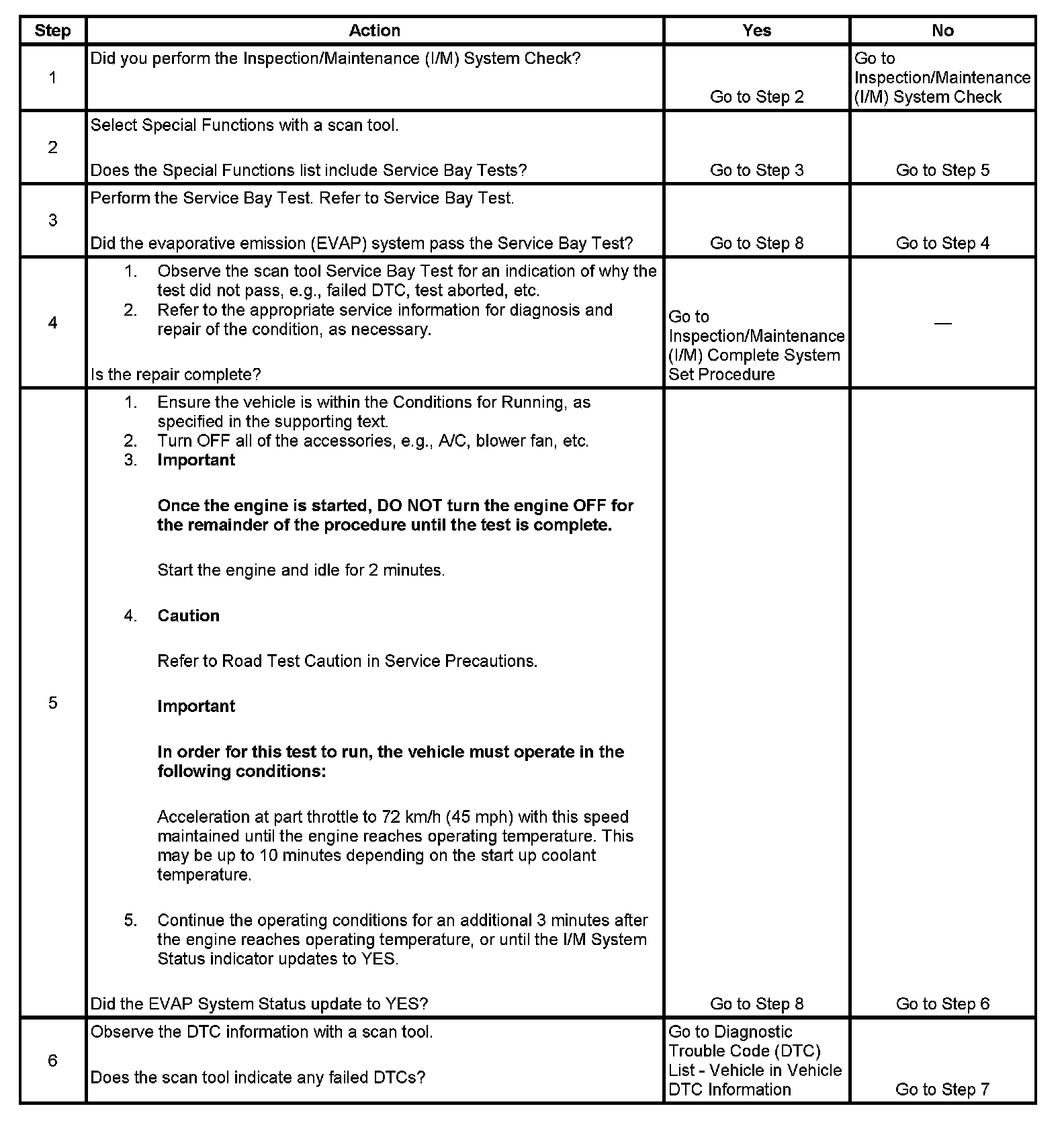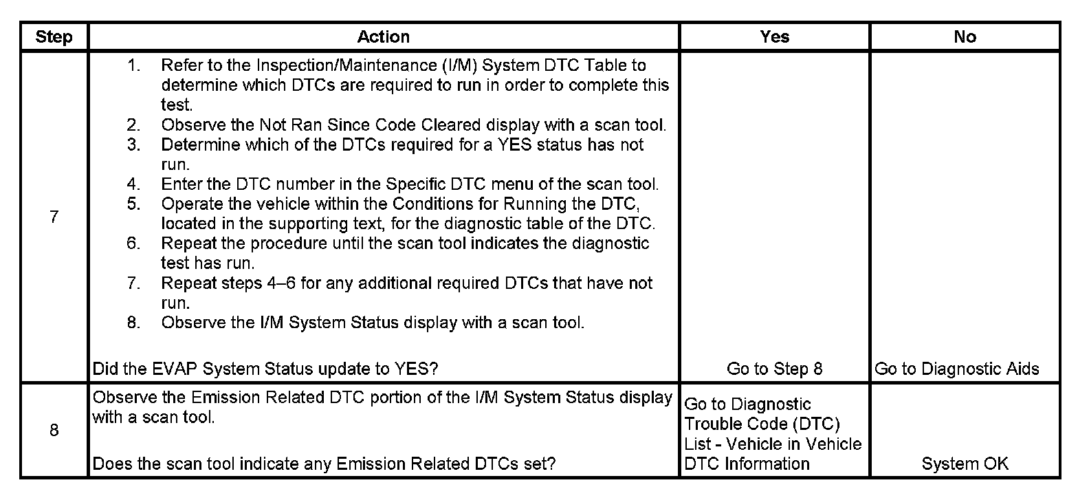 The purpose of this test is to satisfy the enable criteria necessary to execute inspection/maintenance (I/M) readiness diagnostics for the evaporative emission (EVAP) system. The test may be used to set the I/M System Status indicators to YES. The I/M System Status display on the scan tool indicates whether or not the control module has completed the required test. The required test is complete when either all of the DTCs comprising the test have run and passed, or when any one of the DTCs comprising the test has illuminated the malfunction indicator lamp (MIL). Once the test is complete, the I/M System Status display will indicate YES in the completed column. Performing a visual inspection prior to running the EVAP test may prevent having to repeat the test due to the fact that a failed or aborted test will require the vehicle to cool down in order to meet the enable criteria to run another test.
