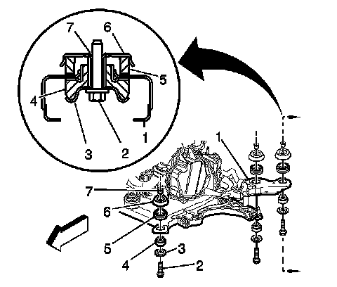 3. Install the engine frame insulator fasteners (3) to retain the engine frame (2) to the vehicle.