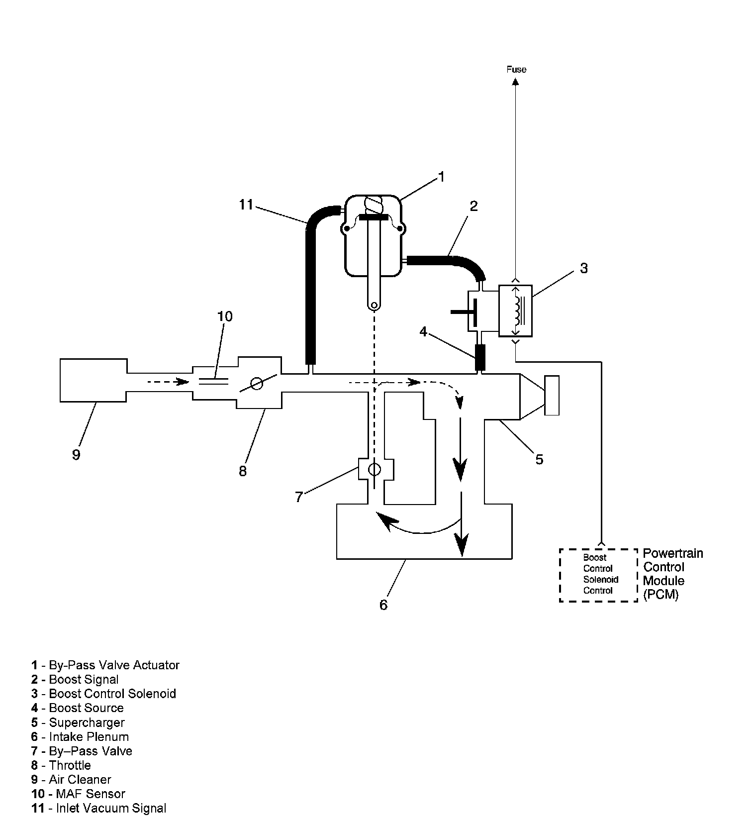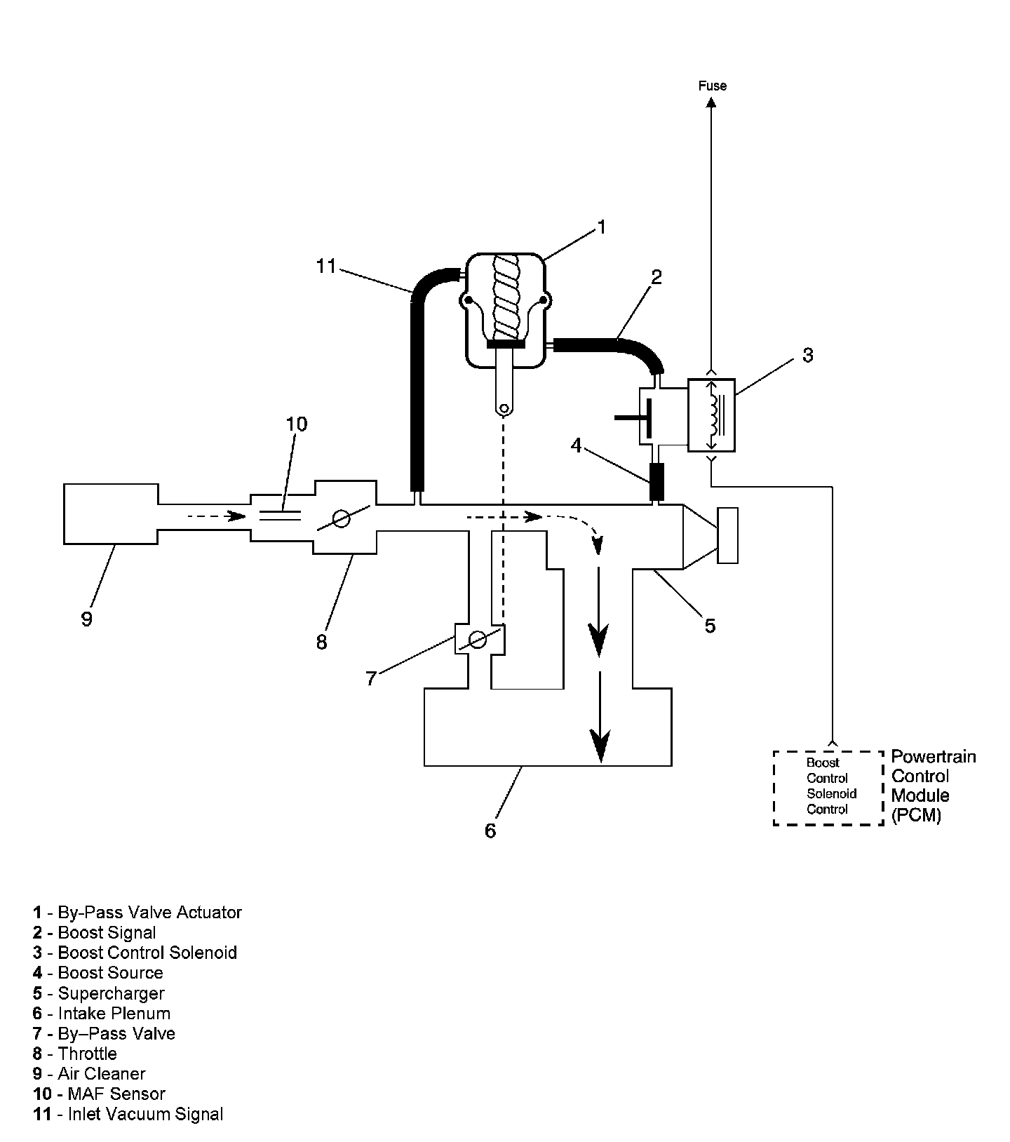 The PCM controls boost pressure by using the boost control solenoid. The boost control solenoid is normally an open valve. Under most conditions, the PCM commands the boost control solenoid to operate at a 100 percent duty cycle. This keeps the solenoid valve closed and allows only inlet vacuum to control the position of the bypass valve. At idle, engine vacuum is applied to the upper side of the bypass valve actuator, counteracting spring tension to hold the bypass valve open. As engine load is increased, engine vacuum is decreased, causing the spring in the bypass valve actuator to overcome the applied vacuum, closing the bypass valve and allowing the boost pressure to increase. When reduced boost pressure is desired, the PCM commands the boost control solenoid to operate at a 0 percent duty cycle. This opens the solenoid valve and allows boost pressure to enter the bypass valve actuator at the lower side to counteract the spring tension, opening the bypass valve and recirculating excess boost pressure back into the supercharger inlet.