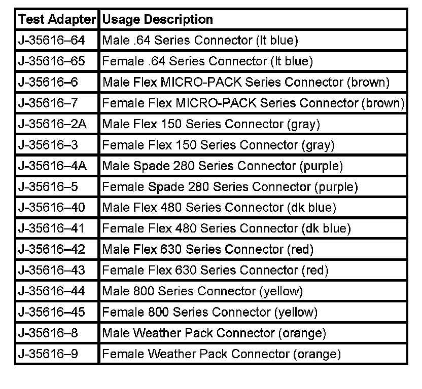NOTE: Do not insert test equipment probes (DVOM etc.) into any connector or fuse block terminal. The diameter of the test probes will deform most terminals. A deformed terminal will cause a poor connection, which will result in a system failure. Always use the J-35616 GM-Approved Terminal Test Kit or the J 42675 Flat-Wire Probe Adapter in order to front probe terminals. Do not use paper clips or other substitutes to probe terminals.