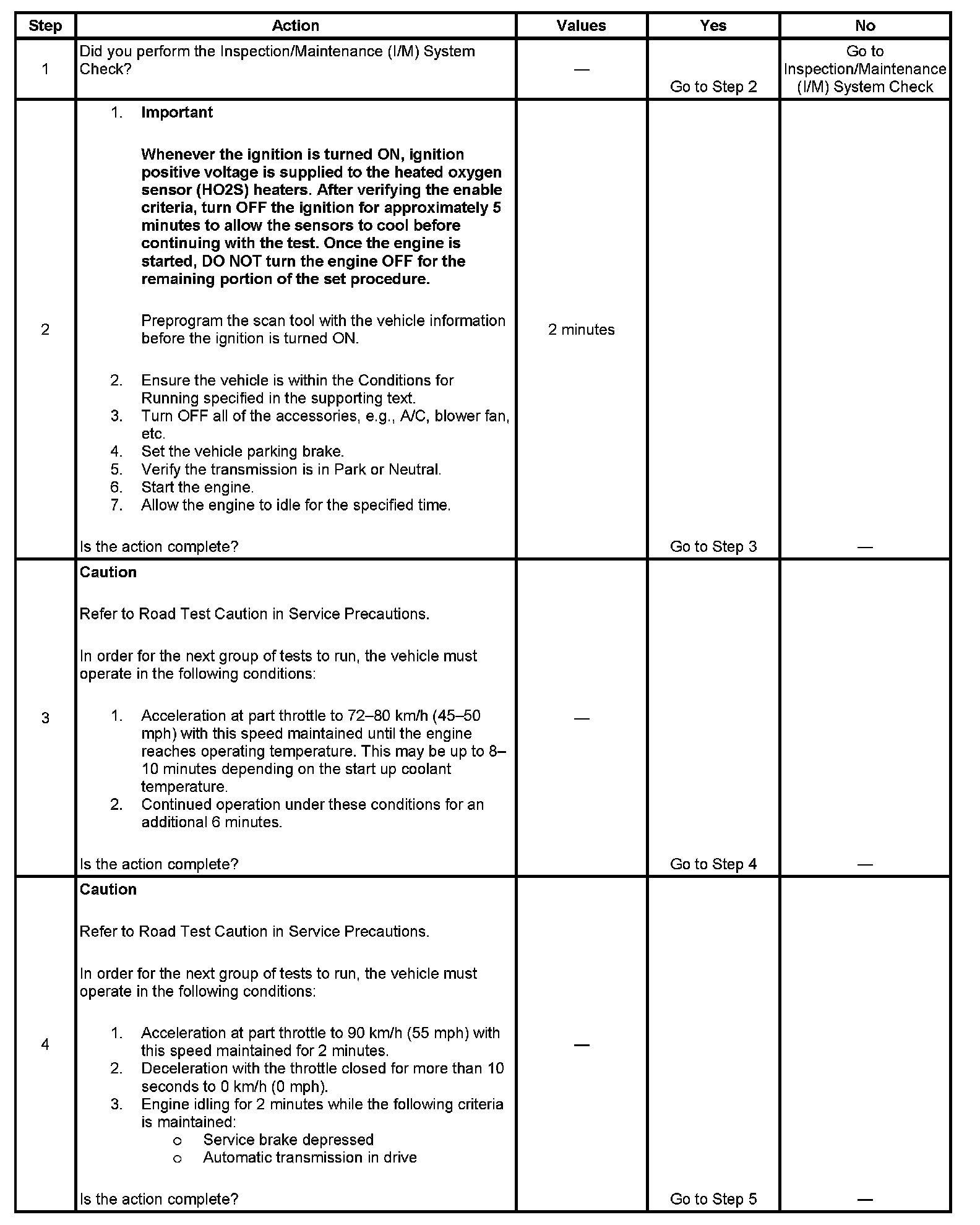 The scan tool can be used to monitor each of the I/M System Status indicators during the I/M Complete System Set Procedure. When all of the indicators for a test step have updated to YES, testing can move on to the next step even if the remaining portion of the test is not complete. For example, step 3 is designed to run the catalyst and HO2S tests. The procedure instructs the technician to operate the vehicle in the enable conditions for 8-10 minutes. If both tests have updated to YES within 4 minutes, it is not necessary to continue with the enable conditions and testing can advance to the next step.