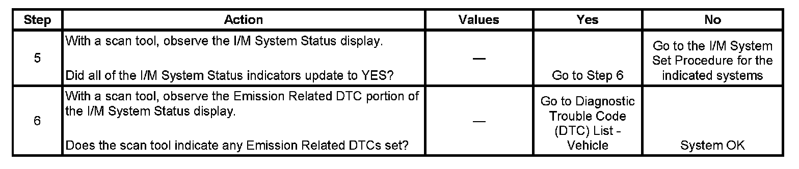 6. The I/M system status only reports on whether or not a diagnostic has run, not what the outcome of the test was. If any emission related DTC sets after the tests are complete, the DTC will require diagnosis.