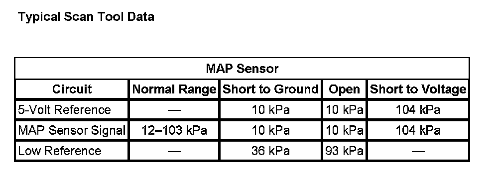 - If more than 34 kPa, test for an intermittent and for a poor connection at the MAP sensor.