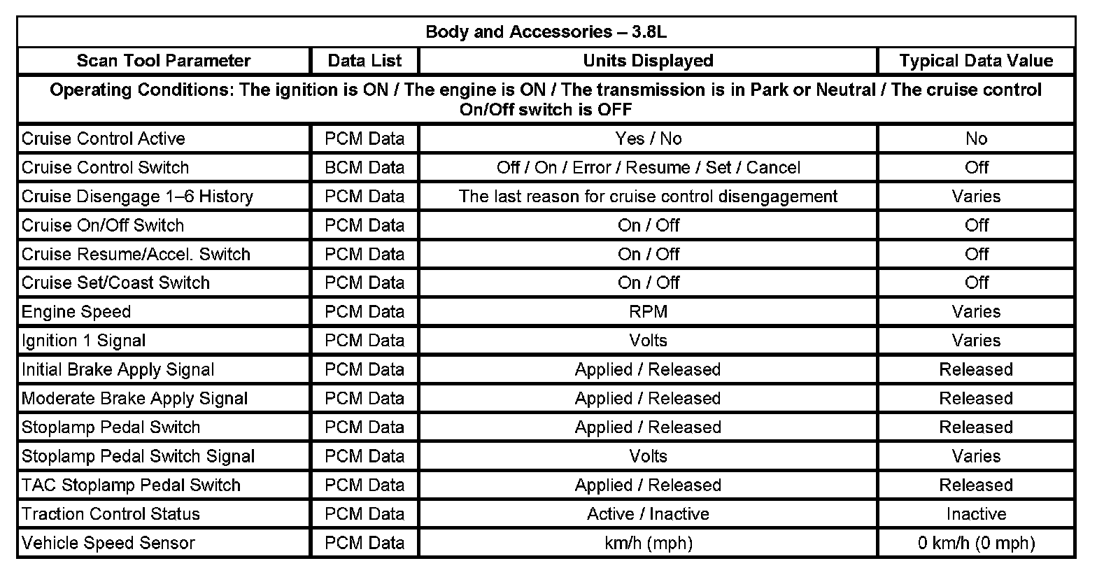 The scan tool data lists contain all of the cruise control related parameters that are available on the scan tool. The parameters in the list are arranged in alphabetical order. The data list column indicates the location of the parameter within the scan tool menu selections.
