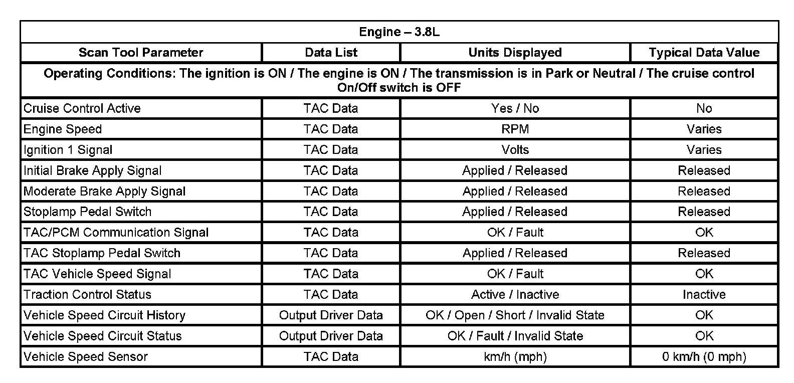 The typical data values are obtained from a properly operating vehicle under the conditions specified in the first row of the scan tool data list table. Comparison of the parameter values from the suspect vehicle with the typical data values may reveal the source of the customer concern.