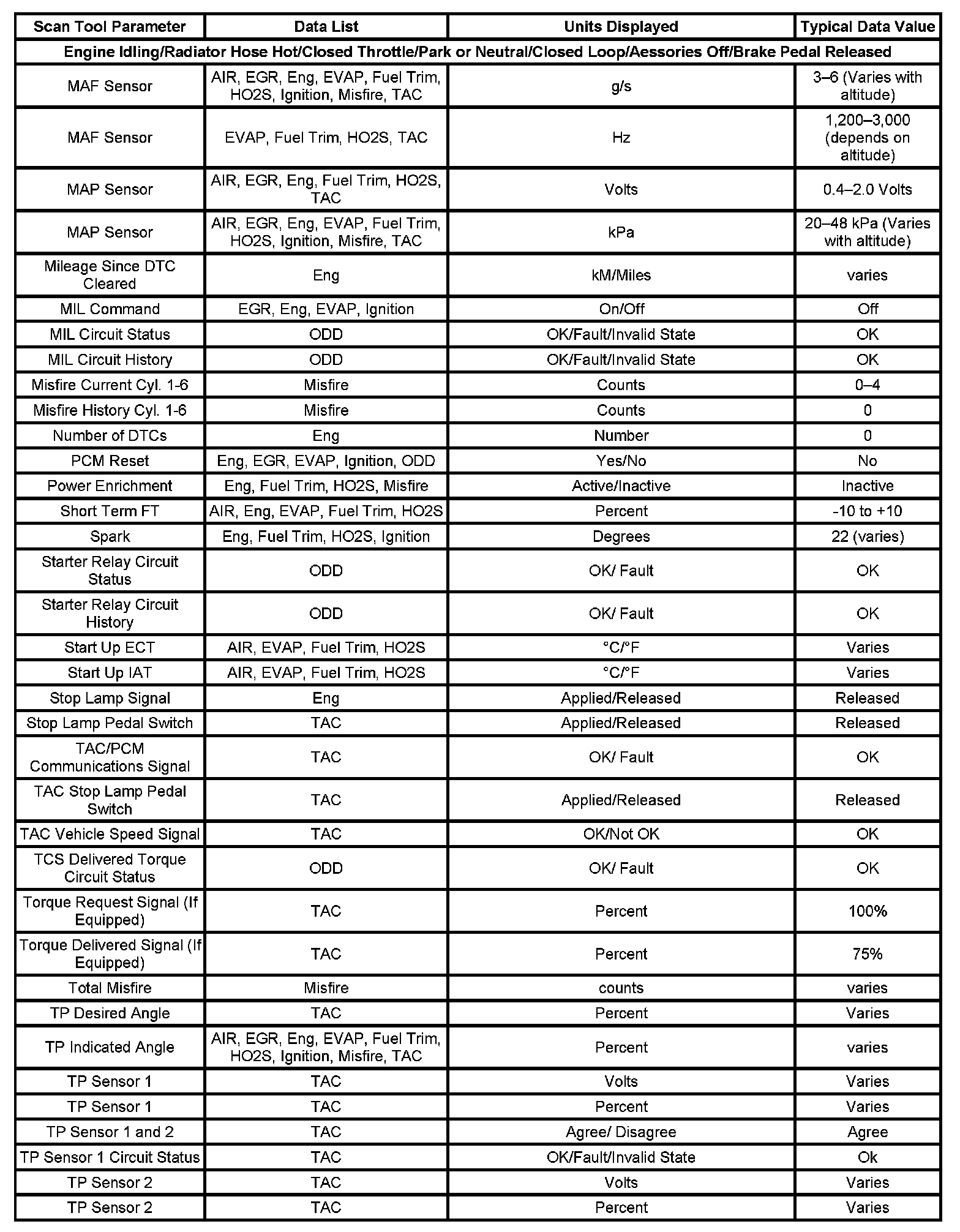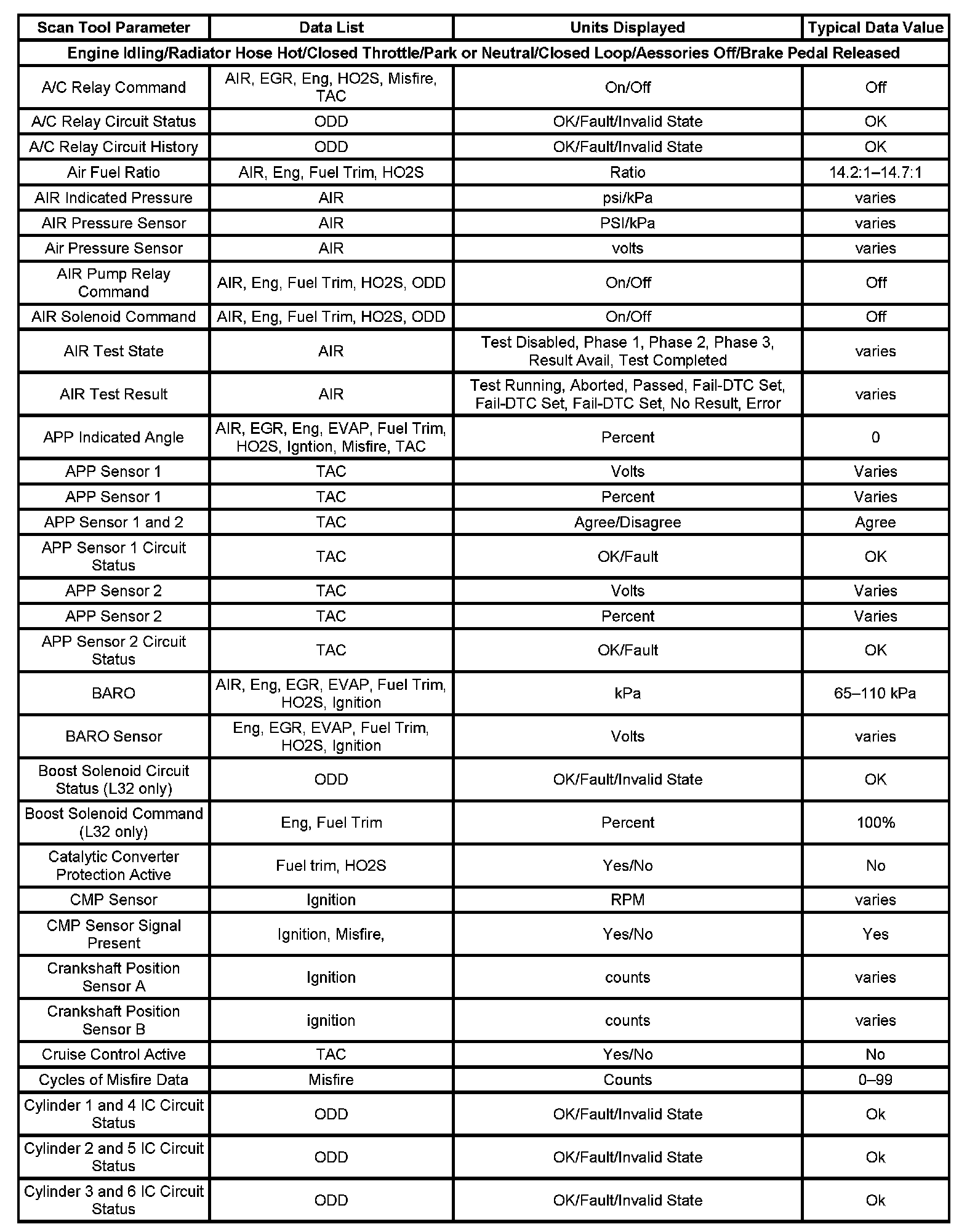 The Engine Scan Tool Data List contains all engine-related parameters that are available on the scan tool. The list is arranged in alphabetical order. A given parameter may appear in any one of the data lists, and in some cases may appear more than once, or in more than one data list in order to group certain related parameters together.