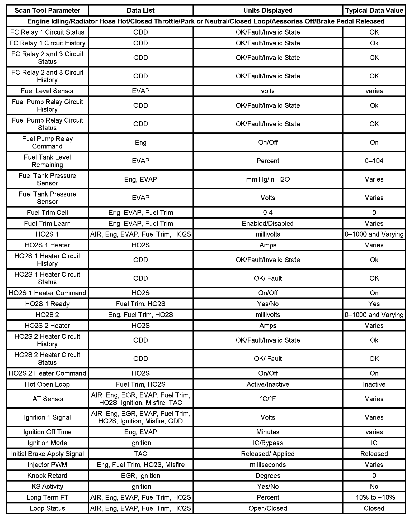The scan tool values from a properly running engine may be used for comparison with the engine you are diagnosing. The Engine Scan Tool Data List represents values that would be seen on a normally running engine.