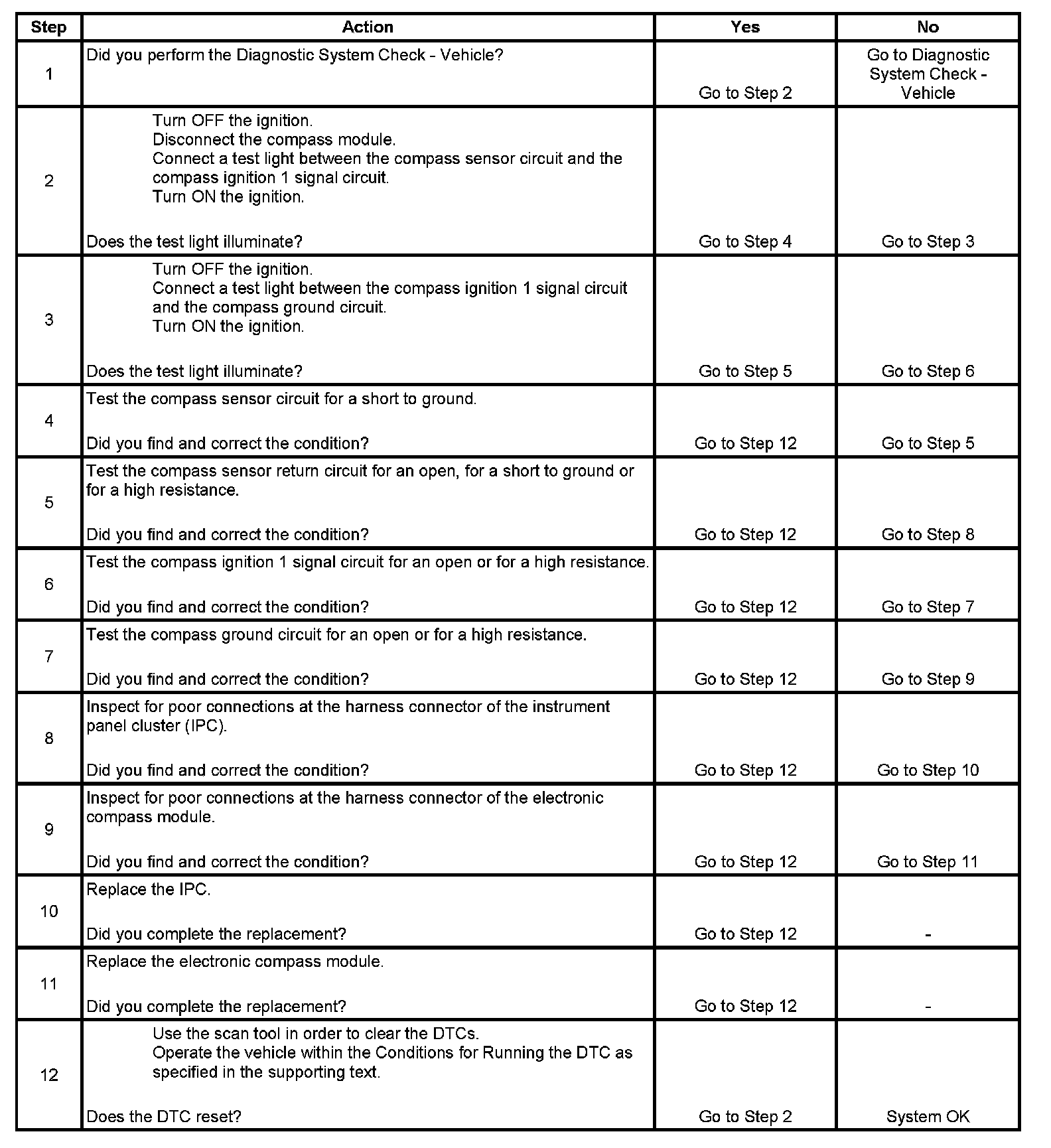 The internal fault detection of the electronic compass module is handled by the instrument panel cluster (IPC). The compass information is sent to the IPC via 2 discreet wire inputs from the electronic compass module. The IPC displays compass information in the driver information center (DIC). The IPC sets DTC B0933 when either compass sensor circuit is shorted to ground.