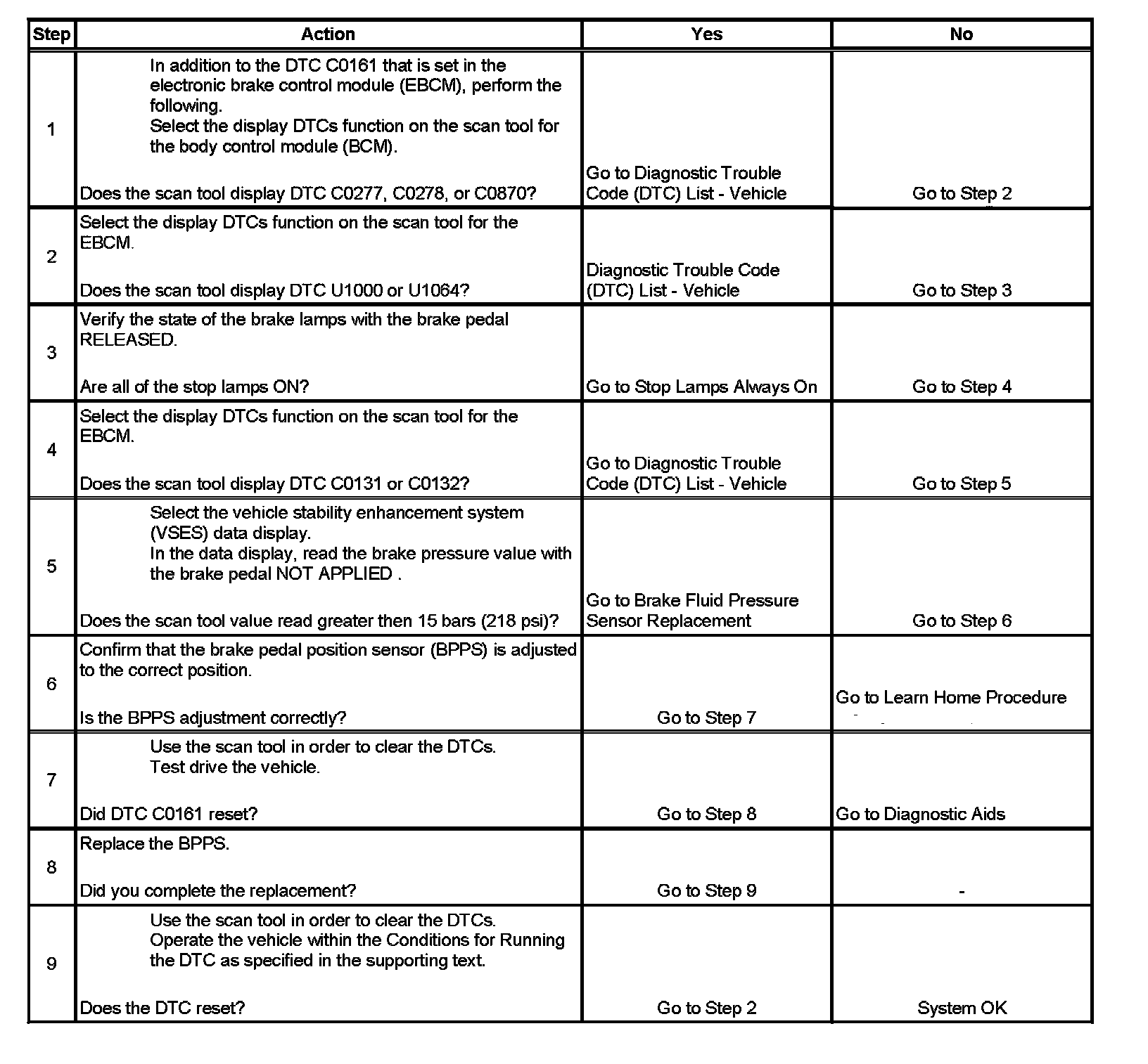 The brake pedal position sensor (BPPS) is used by the body control module (BCM) to determine the brake pedal angle for various electrical components. The BPPS is a potentiometer type sensor with 3 circuits: a 10-volt reference circuit, a low reference circuit, a brake apply sensor signal circuit. The BCM provides the BPPS with 10 volts on the 10-volt reference circuit and a ground on the low reference circuit. Application of the BPPS rotate from the closed brake pedal position to the full apply position provides the BCM with a signal voltage from less than 1 volt to greater than 9 volts through the BPPS signal circuit. When the conditions for running this DTC are met, the BCM will use the brake fluid pressure sensor to determine if the predicted operating range of the BPPS is correct. If the BCM detects the BPPS voltage is out of the predicted range, the BCM will send a class 2 message to the electronic brake control module (EBCM) to set DTC C0161. The EBCM will set DTC C0131 or C0132 for a brake fluid pressure sensor fault. The BCM will set DTC C0277, C0278, or C0870 if a fault is detected in the BPPS.
