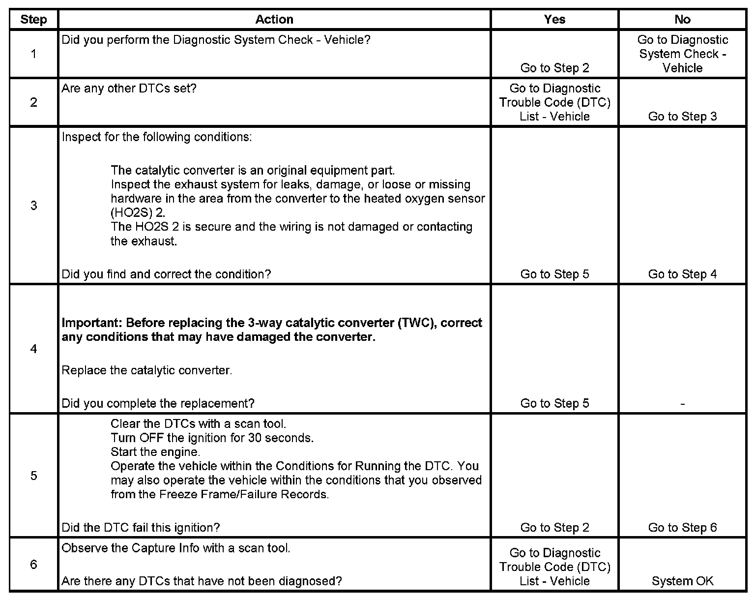 In order to maintain a reasonably low emission level of hydrocarbons (HC), carbon monoxide (CO), and oxides of nitrogen (NOx) a 3-way catalytic converter (TWC) is used. The catalyst within the converter promotes a chemical reaction that oxidizes the HC and CO present in the exhaust gas. This reaction converts the gases into harmless water vapor and carbon dioxide. The catalyst also reduces the NOx, converting the NOx into nitrogen. The engine control module (ECM) monitors this process using the post catalyst heated oxygen sensor (HO2S) signal. The post-catalyst HO2S located in the exhaust stream after the TWC, produces an output signal that indicates the oxygen storage capacity of the catalyst. The oxygen storage capacity (OSC) determines the ability of the catalyst to convert the exhaust emissions effectively. If the catalyst is functioning correctly, the post-catalyst HO2S signal will be far less active than the signal produced by the pre-catalyst HO2S.