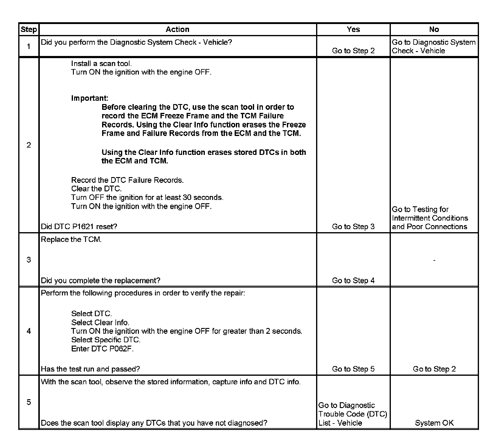 While the vehicle is being driven, engine and transmission data accumulates in a random access memory (RAM) device, which cannot store data reliably when the transmission control module (TCM) powers down. Before the TCM powers down, the data is copied from RAM to an electrically-erasable programmable read-only memory (EEPROM) device, sometime referred to as non-volatile memory (NVM). Both the RAM and the EEPROM are inside the TCM. A normal function of the TCM programming is to test the EEPROM at TCM power-down by copying test data from RAM to the EEPROM and then comparing the 2 copies. If they do not match, DTC P062F will set. DTC P062F is a type A DTC.