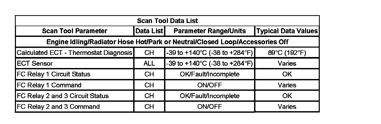 The Engine Scan Tool Data List contains all cooling system related parameters that are available on the scan tool. The list is arranged in alphabetical order. A parameter may appear in any one of the data lists, and in some cases may appear more than once, or in more than one data list in order to group certain related parameters together.