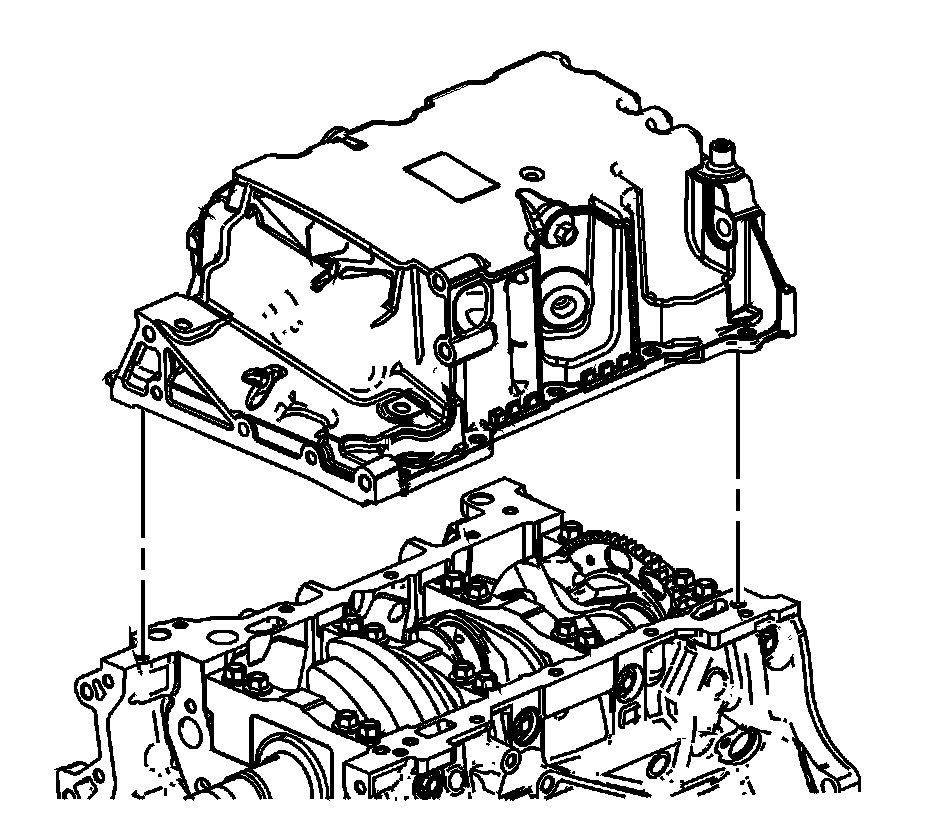 1. Install the 8 mm (0.315 in) guides from the EN 46109 into the center oil pan rail bolt hole on each side of the engine block.
