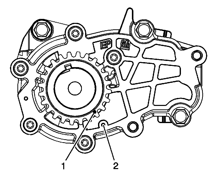 3. Ensure the crankshaft is in the stage one timing position with the crankshaft sprocket timing mark (1) aligned to the stage one timing mark on the oil pump cover (2) using the EN 46111.