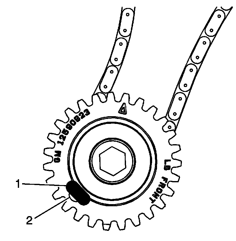 5. Place the left secondary camshaft drive chain around the inner sprocket of the left camshaft intermediate drive chain idler with the timing camshaft drive chain link (1) aligned to the alignment access hole (2) made in the left camshaft intermediate drive chain idler outer sprocket.