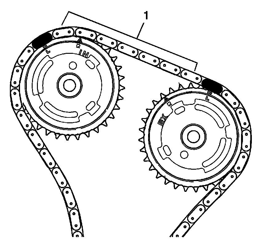 7. Ensure there are 7 links (1) between the timing camshaft drive chain links for the camshaft position actuator sprockets.