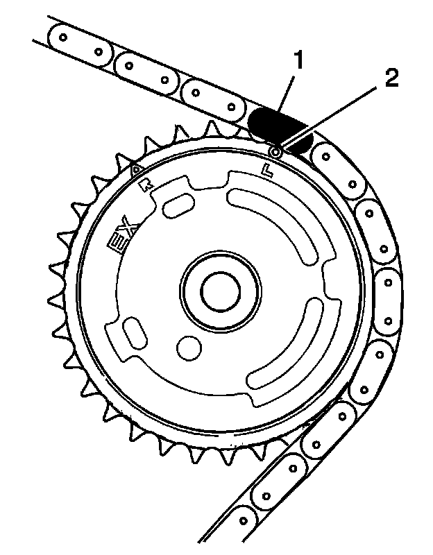 8. Align the left exhaust camshaft position actuator sprocket alignment circle mark (2) with the timing camshaft drive chain link (1).
