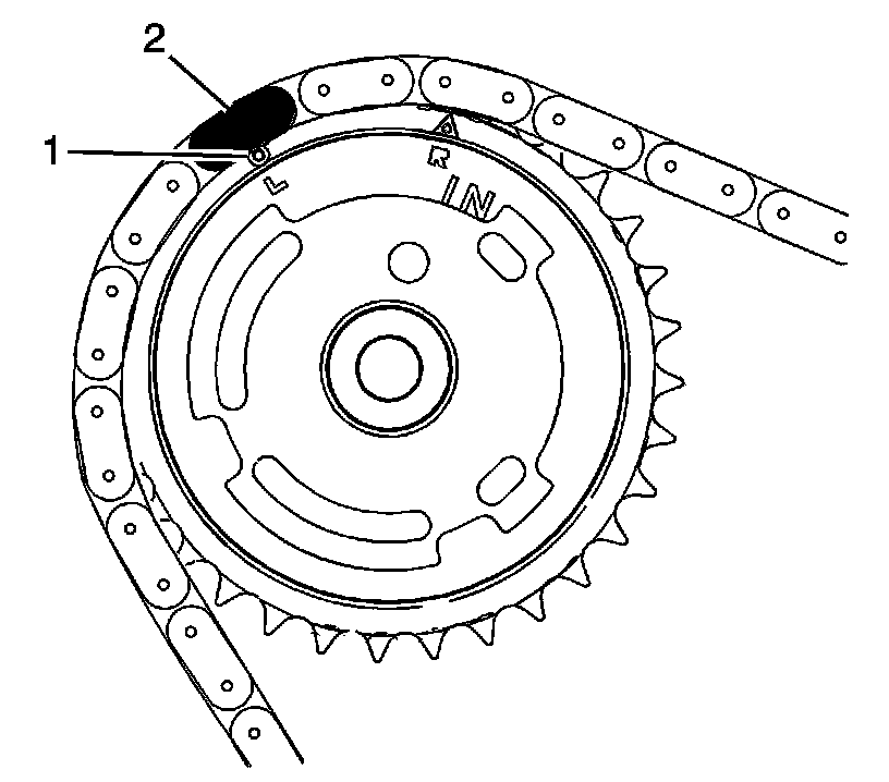9. Align the left intake camshaft position actuator sprocket alignment circle mark (1) with the timing camshaft drive chain link (2).