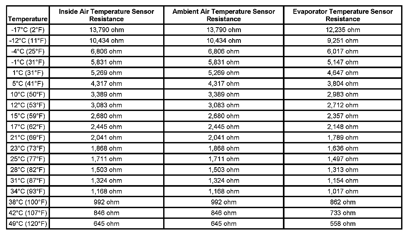 Sensor Resistance Table