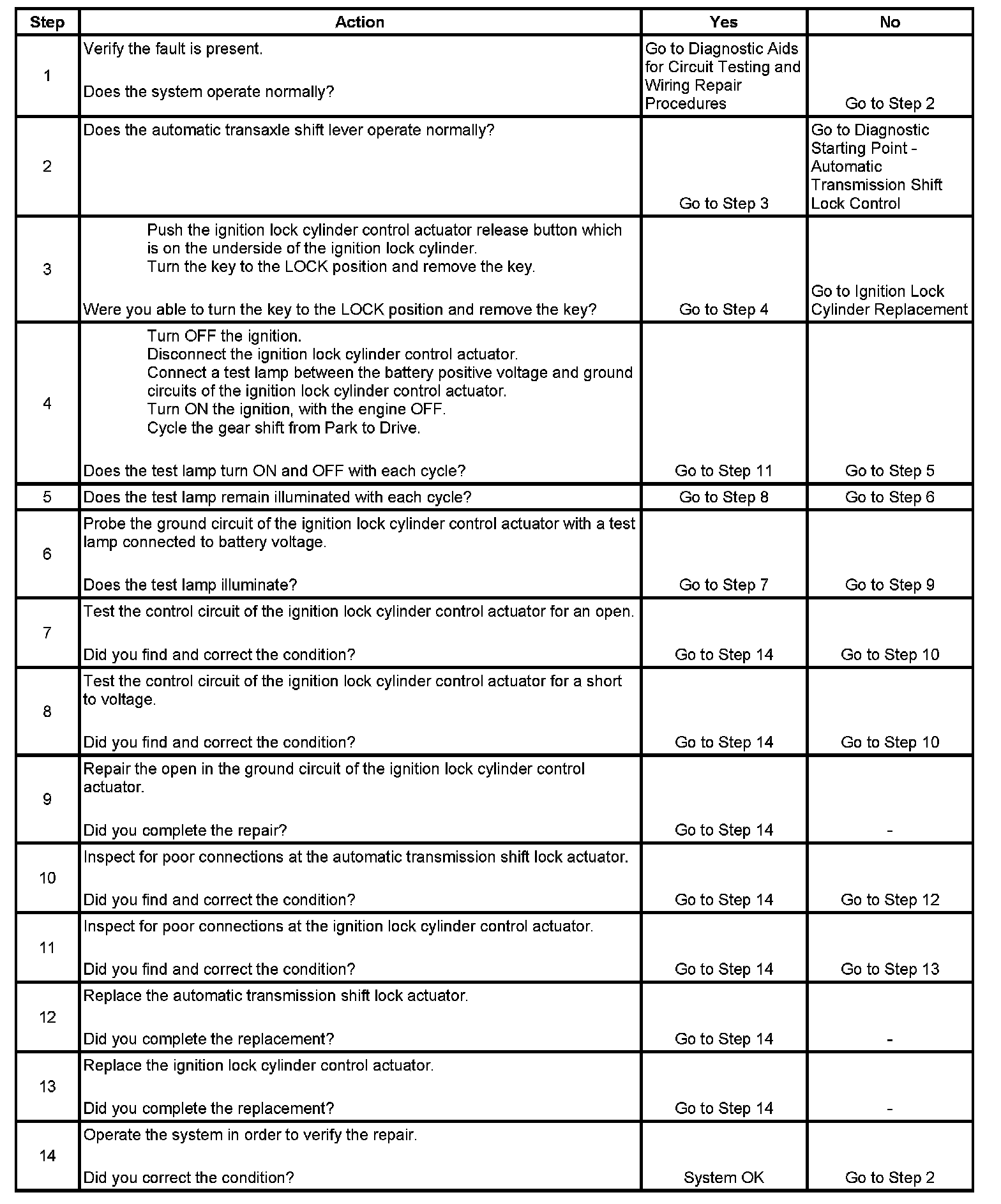 If the vehicle is equipped with a floor mounted console gearshift, an ignition lock cylinder control actuator system is used in the steering column. The purpose of the system is to prevent the ignition lock cylinder from being turned to the lock position while the transmission is in gear. This would also prevent the steering wheel from being locked. The system consists of an ignition lock cylinder actuator and a park position switch. The actuator contains a pin that is spring loaded out, to prevent the ignition lock cylinder from being turned to the lock position when the gearshift is not in PARK. The park position switch is located in the floor mounted gearshift assembly, as part of the automatic transmission shift lock control switch. The switch is closed with the gearshift in PARK, and open in all other positions