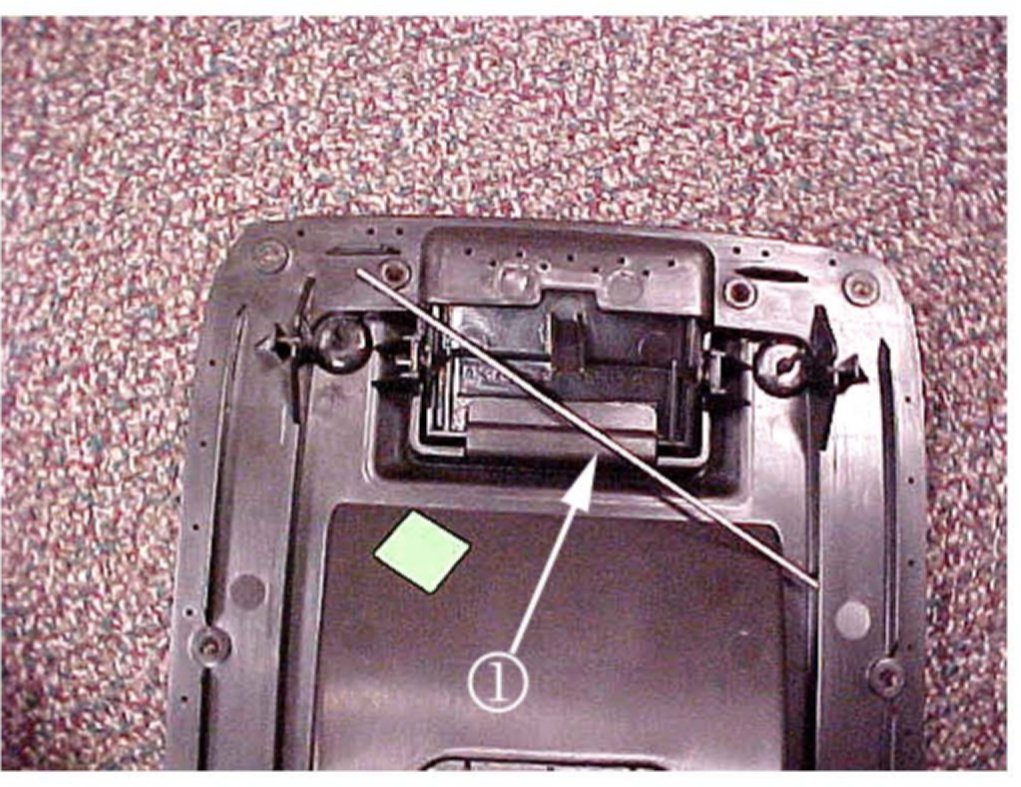This condition may be caused by the latch spring (1) inside the armrest lid assembly popping out of the mounting pins. This may result in loose spring tension in the latch.
