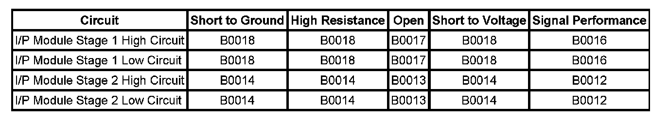 * The I/P module stage 1 or stage 2 high and/or low circuits is short to ground or short to voltage for 500 milliseconds.