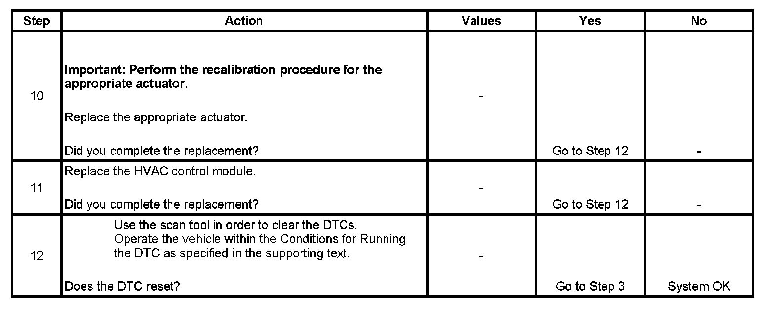 * The actuator fails calibration/recalibration due to an over travel or under travel condition. The HVAC control module does not detect the calibrated number of total pulse counts during a travel range check.
