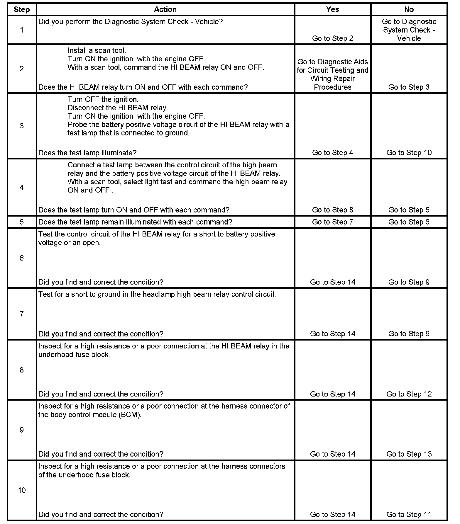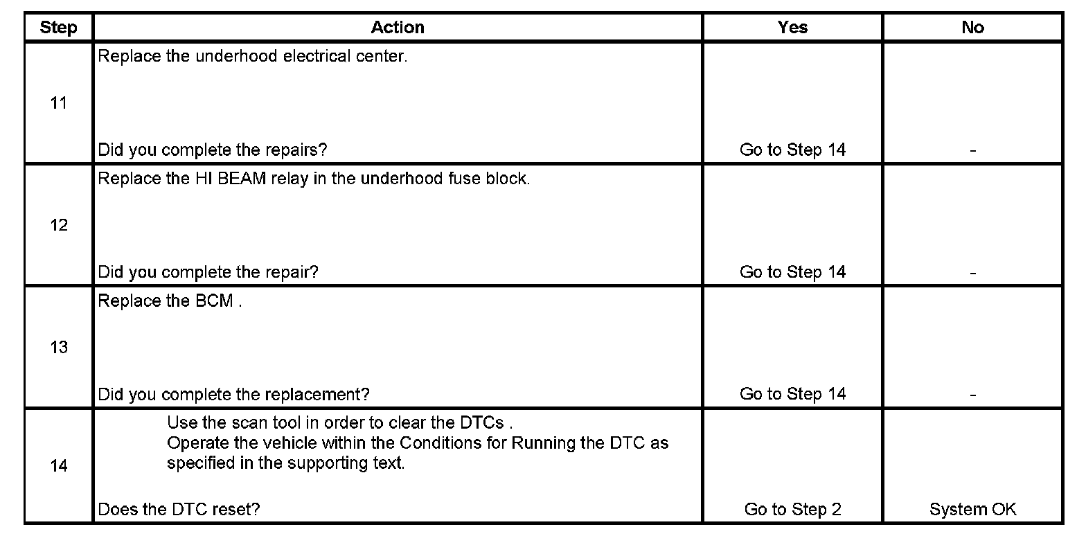 * When the BCM receives a high beam headlamp OFF command and the high beam headlamp relay control circuit is shorted to ground.