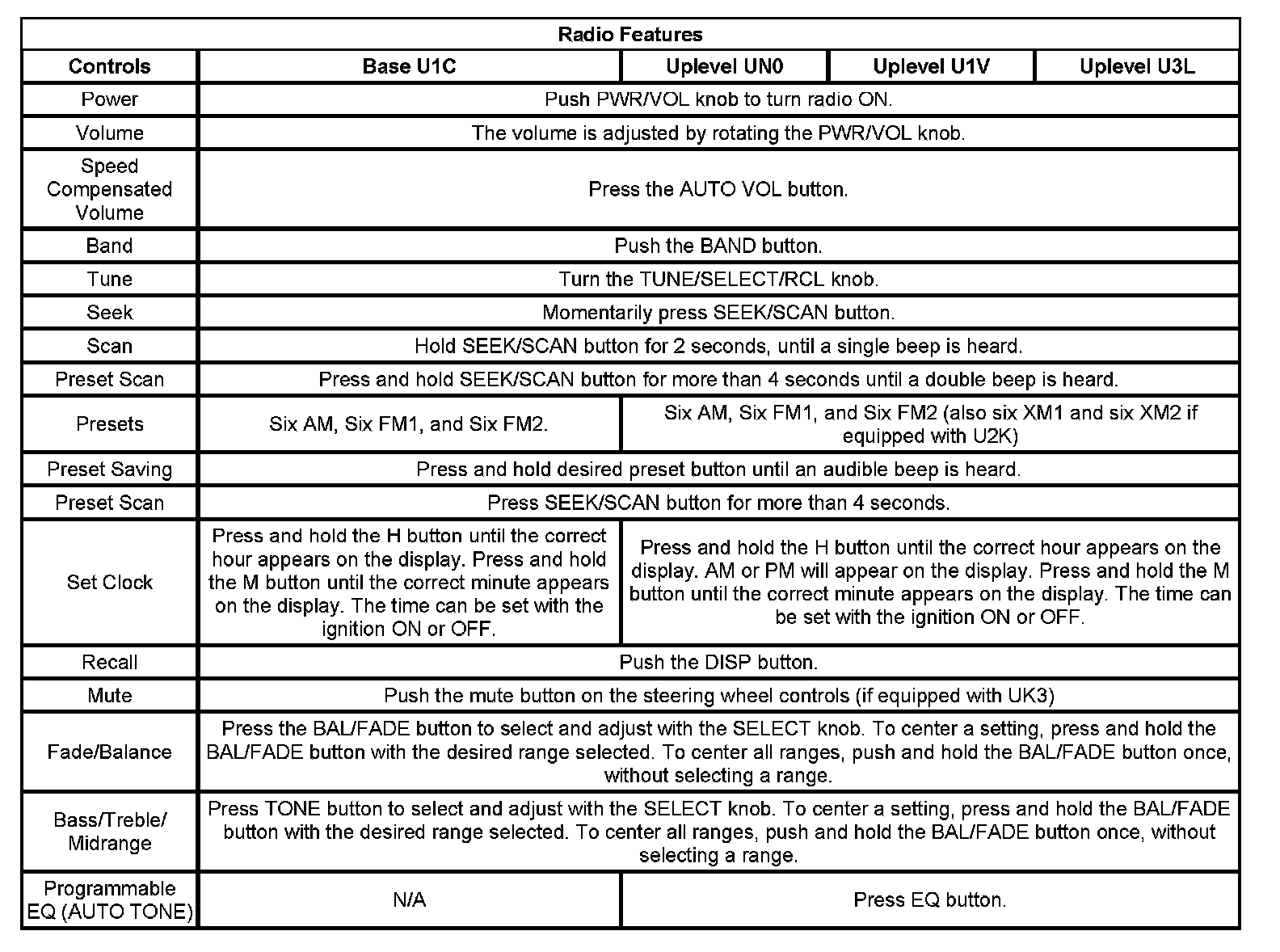 The uplevel system differs from the base system by providing the customer with enhanced audio system features. Some of those features may include an audio amplifier, and programmable equalizer (EQ). Satellite digital radio (U2K) is available with the uplevel systems.
