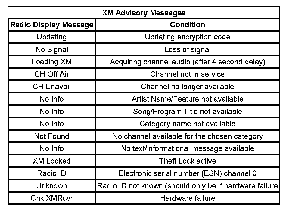 XM is a national satellite radio service that offers up to 100 coast to coast channels including music, news, sports, talk and children's programming. XM provides digital quality audio and text information, including song title and artist name. A service fee is required in order to receive the XM service. For more information, contact XM at www.xmradio.com or call 1-800-852-9696.
