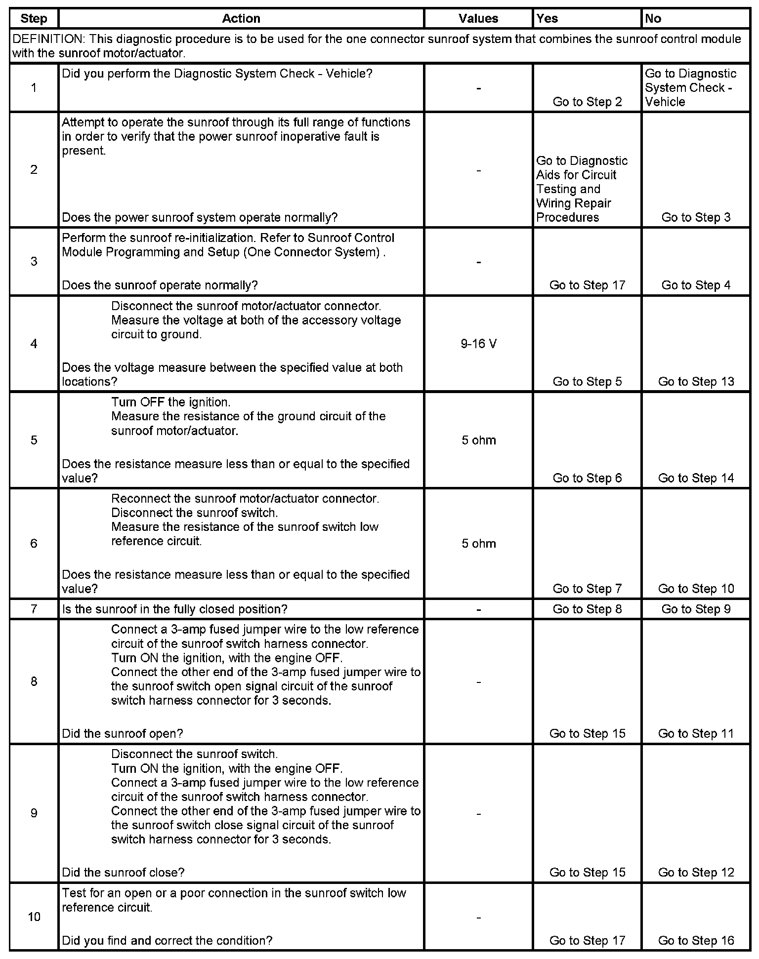 If voltage is not measured on the sunroof switch open signal or sunroof switch close signal circuits, the fault could be in the accessory voltage circuit, battery positive voltage circuit, or sunroof motor/module ground circuit. If the sunroof motor/module is not being powered, neither will the sunroof switch signal circuits.