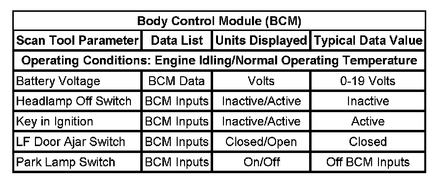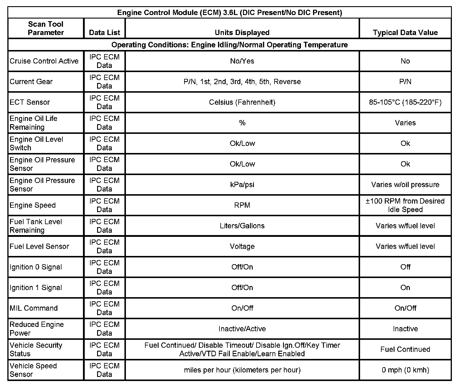 The typical data values are obtained from a properly operating vehicle under the conditions specified in the first row of the scan tool data list table. Comparison of the parameter values from the suspect vehicle with the typical data values may reveal the source of the customer concern.