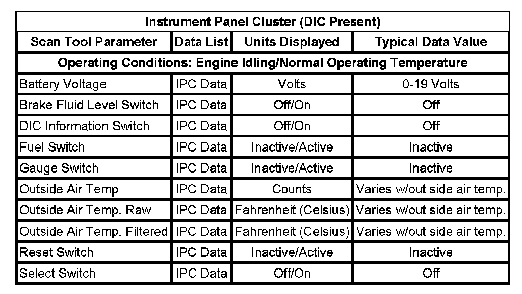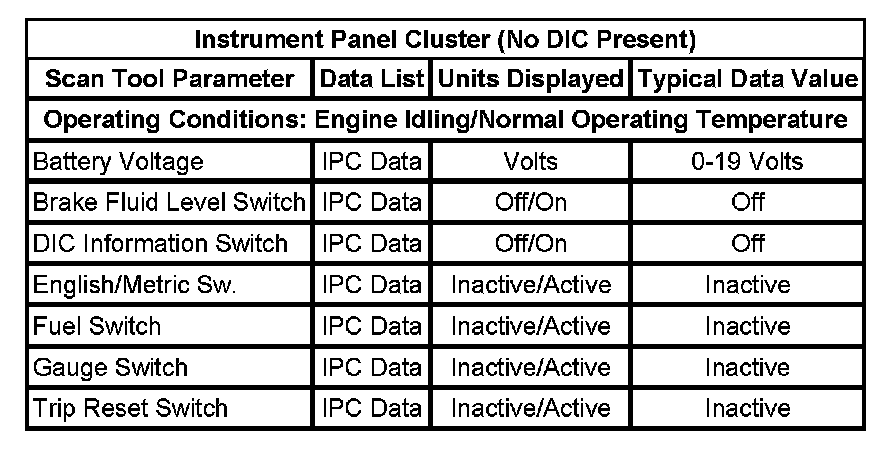 The scan tool data lists contain all the instrument panel, gage, and console related parameters that are available on the scan tool. The parameters in the list are arranged in alphabetical order. The data list column indicates the location of the parameter within the scan tool menu selections.