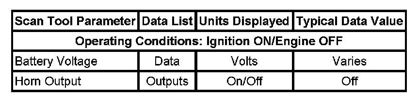 The Horns Scan Tool Data List contains all of the horn related parameters that are available on the scan tool. The parameters in the list are arranged in alphabetical order. The column, Data List, indicates the location of the parameter within the scan tool menu selections. Use the Horns Scan Tool Data List as directed by a diagnostic table or in order to supplement the diagnostic procedures. Begin all of the diagnostic procedures with Diagnostic System Check - Vehicle in Vehicle DTC Information. Initial Inspection and Diagnostic Overview