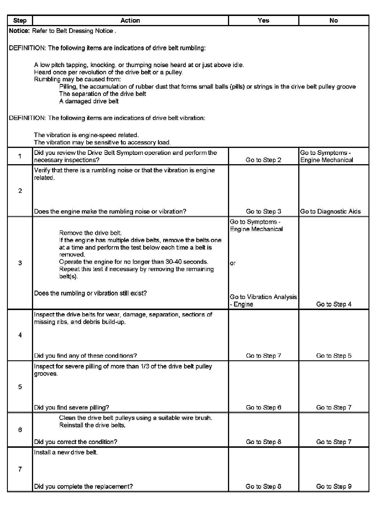 3. This test is to verify that one of the drive belts is causing the rumbling noise or vibration. Rumbling noise may be confused with an internal engine noise due to the similarity in the description. Remove only one drive belt at a time if the vehicle has multiple drive belts. When removing the drive belts the water pump may not be operating and the engine may overheat. Also DTCs may set when the engine is operating with the drive belts removed.