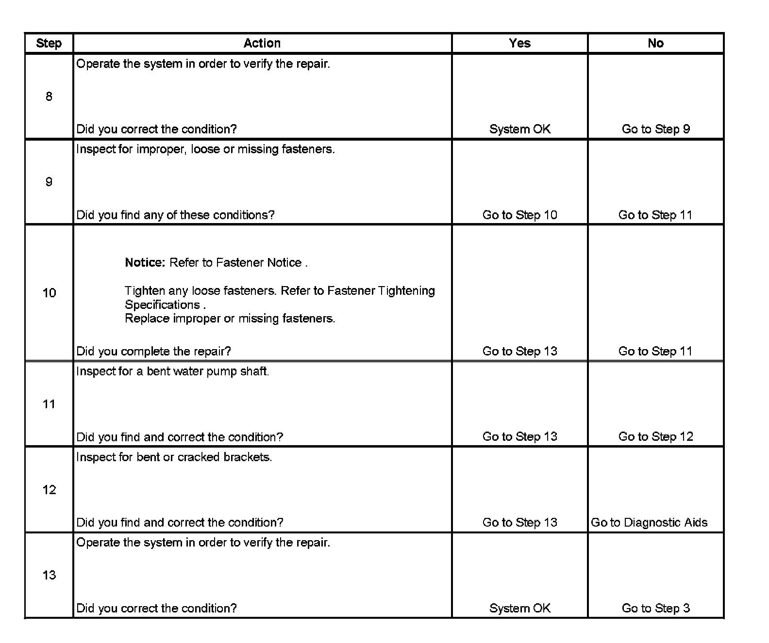 11. This step should only be performed if the water pump is driven by the drive belt. Inspect the water pump shaft for being bent. Also inspect the water pump bearings for smooth operation and excessive play. Compare the water pump with a known good water pump.