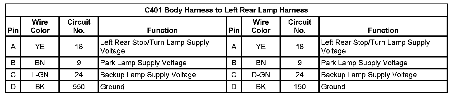 C401 Body Harness to Left Rear Lamp Harness: