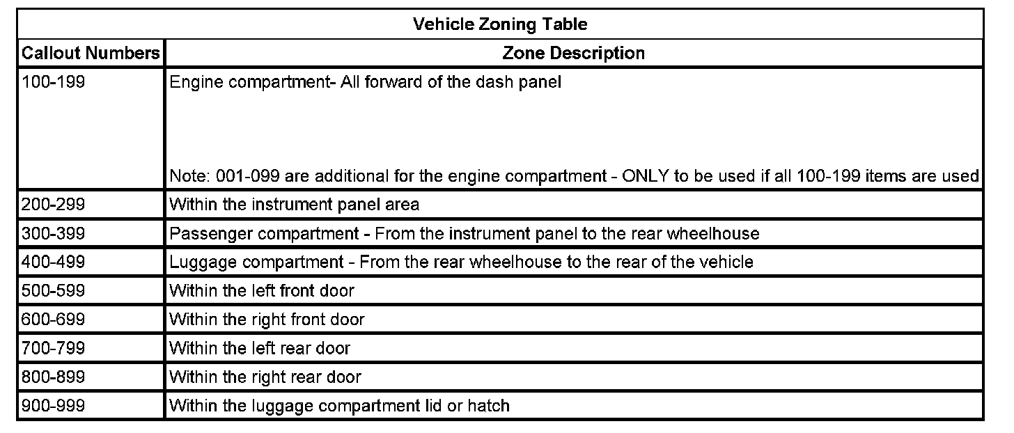 All grounds, in-line connectors, pass-through grommets, and splices have identifying numbers that correspond to where they are located in the vehicle. The table explains the numbering system.