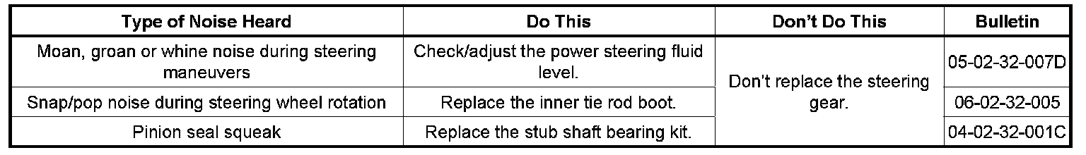 Many customer concerns with the steering system involve specific symptoms (noises heard). Once the customer concern has been verified, the table above may help identify the correct bulletin to reference.