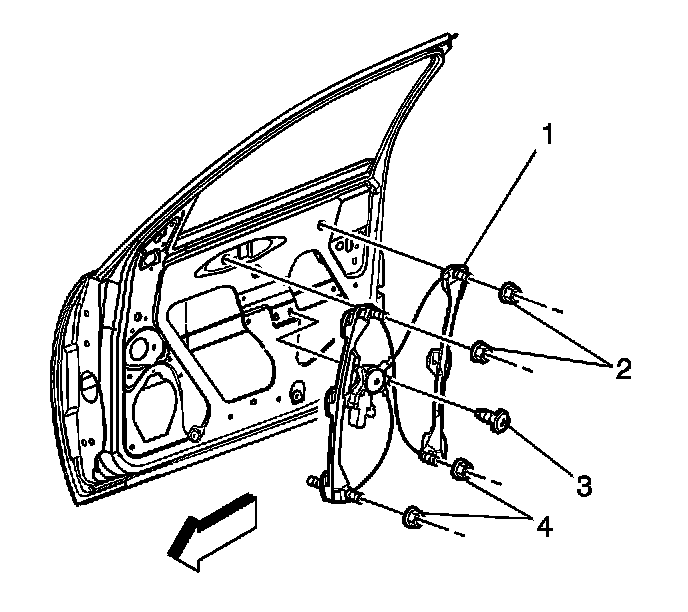2. Tighten the bolts that attach the window regulator (1) to the inner door panel in the specified sequence (2, 3, 4).