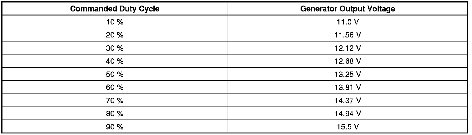 The ECM/PCM controls the generator through the generator field control circuit. It monitors the generator performance through the generator field duty cycle signal circuit. The signal is a 5 volt PWM signal of 128 Hz with a duty cycle of 0-100%. Normal duty cycle is between 5-95%. Between 0-5% and 95-100% are for diagnostic purposes. The following table shows the commanded duty cycle and output voltage of the generator: