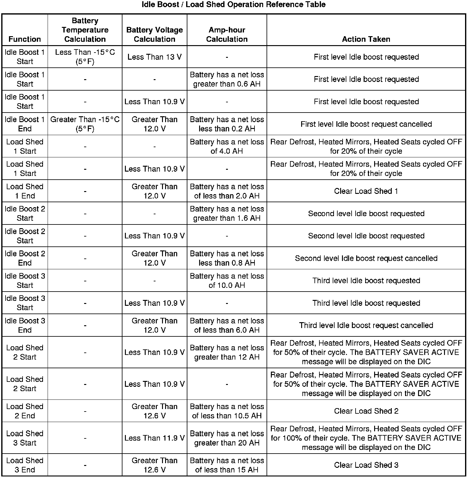 Each EPM function, either idle boost or load-shed, is discrete. No 2 functions are active at the same time. Idle boost is activated in incremental steps, idle boost 1 must be active before idle boost 2 can be active. The criteria used by the body control module (BCM) to regulate EPM are outlined below: