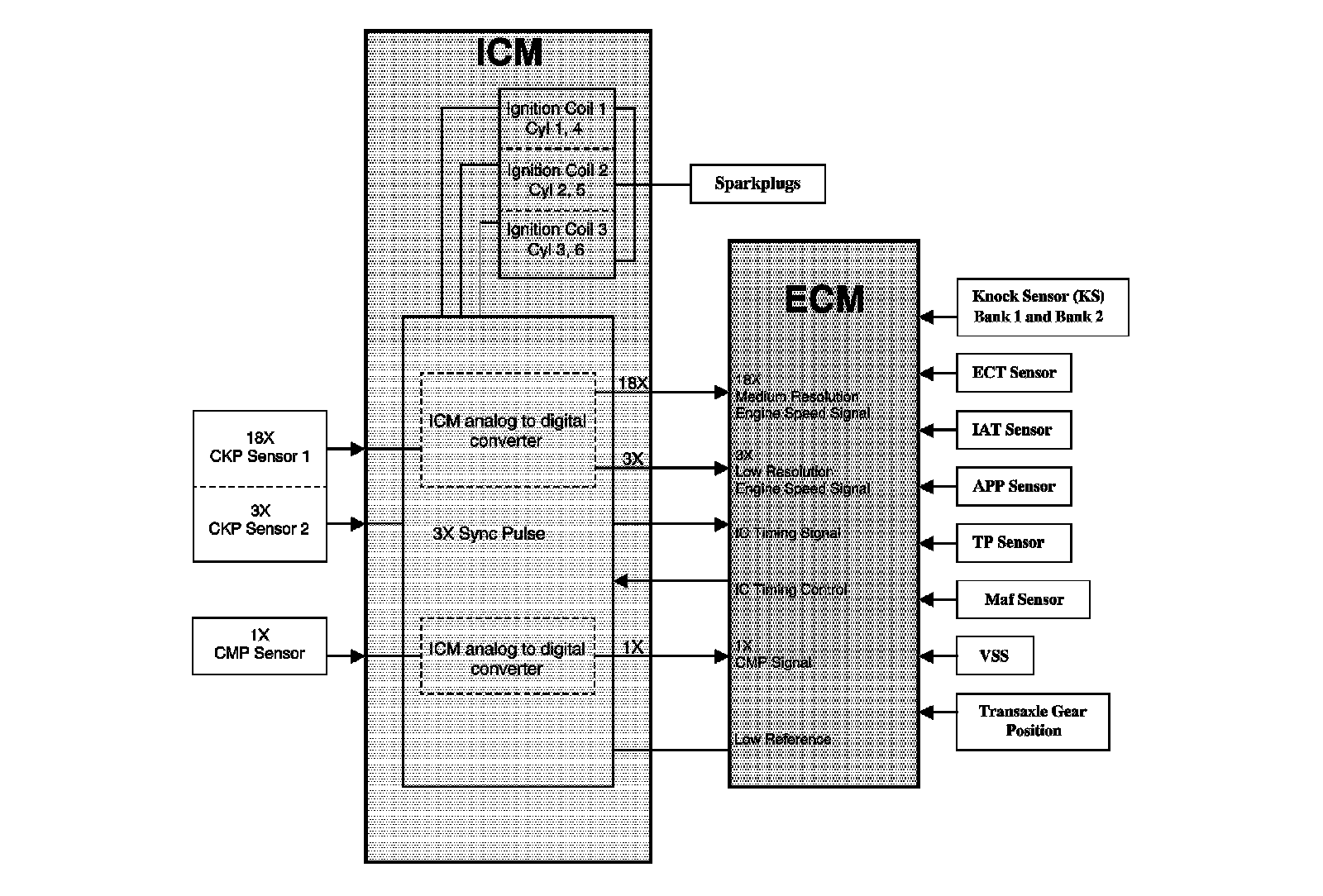 The ICM receives an 18X pulse from the CKP sensor 1 signal circuit and a 3X pulse from the CKP Sensor 2 signal.