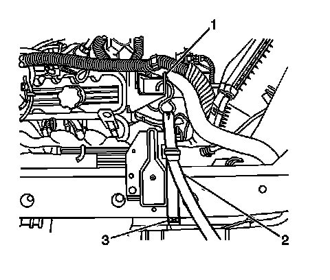 5. Install the J 41131 (2) to the engine mount strut bracket (1) and the upper radiator support (3).
