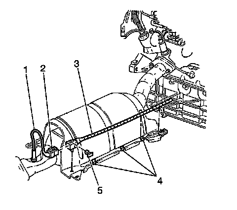 4. Remove the oxygen sensor wiring harness (3) from the catalytic converter heat shield.