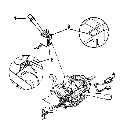 7. Depress the locking tab (2) on the windshield wiper and washer switch (1) and remove the switch from the steering column.